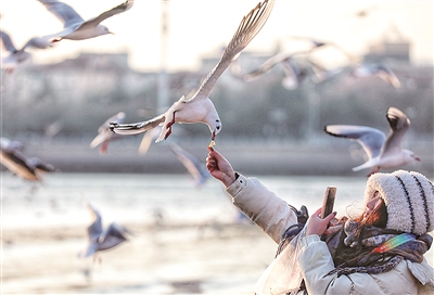 ■栈桥海边,一幅“人鸥和谐图”。 韩 星 摄